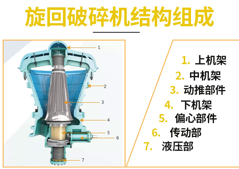 旋回式破碎機主要由橫梁部、上中下機架部、動錐部、偏心套部、傳動部和液壓缸部等組成.在設備工作時,由電動機帶動水平軸旋轉,水平軸通過齒輪帶動偏心套旋轉,再由偏心套帶動動錐部做圓周擺動,從而實現連續的擠壓破碎石塊??赏ㄟ^調節動錐底部的液壓缸改變排礦口的大小,方便調整產品粒度;同時液壓缸也提供過鐵保護功能,當有不能破碎的物體進入破碎腔時,液壓缸能自動使動錐下落釋放物體,保護破碎機。